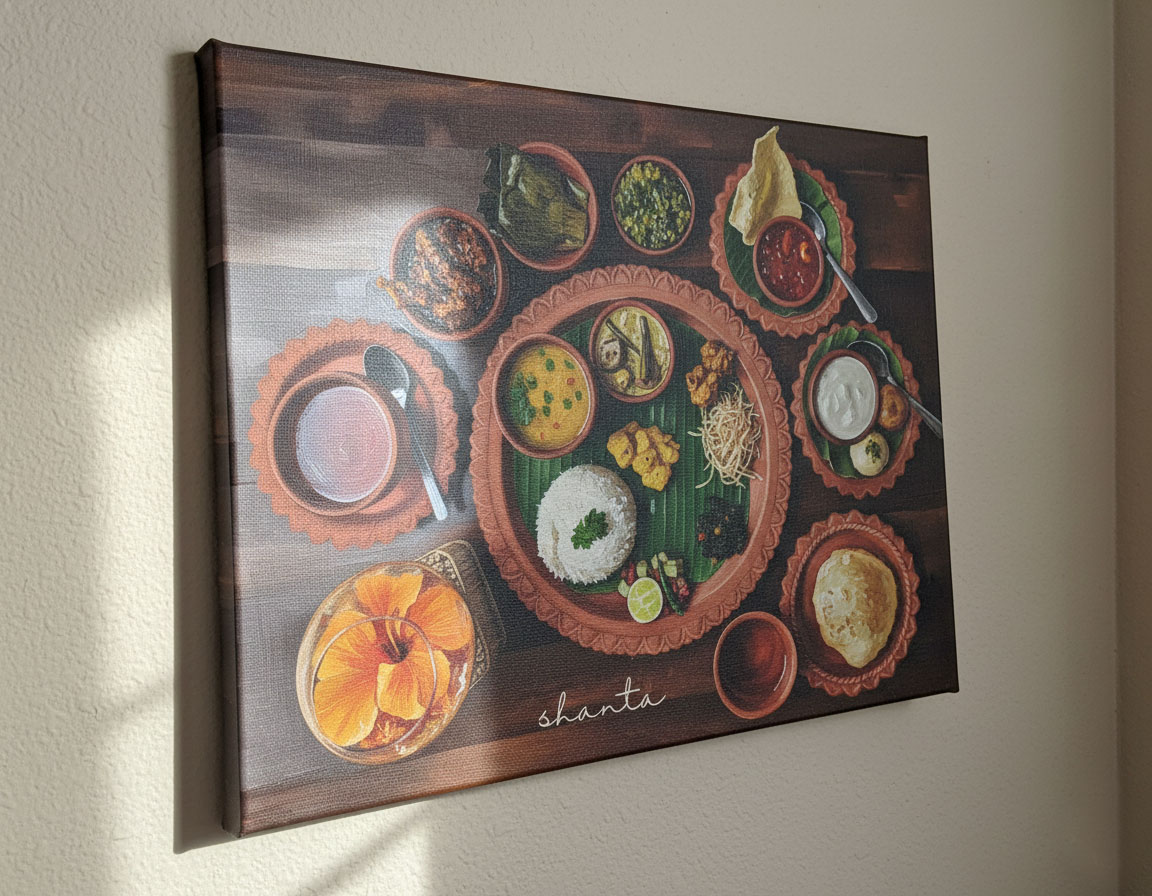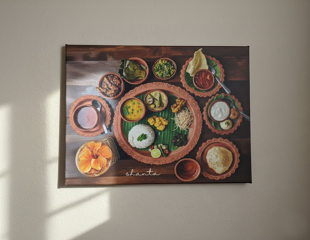 From an artist’s perspective, this work is about structure and generosity coexisting. Bengali cuisine does not rely on excess; it is thoughtful, layered, and deeply connected to the seasons. I chose earthy terracotta tones for the plates, deep greens for the banana leaf, and warm natural hues for the food to echo the familiarity of clay utensils and wooden dining tables. These colors are meant to feel comforting, almost tactile, like memories you can reach out and touch.